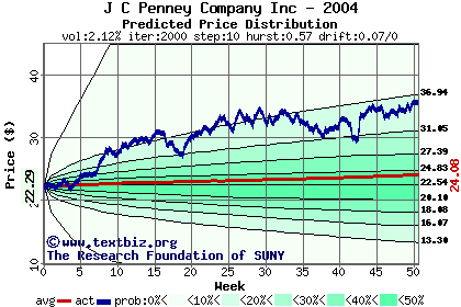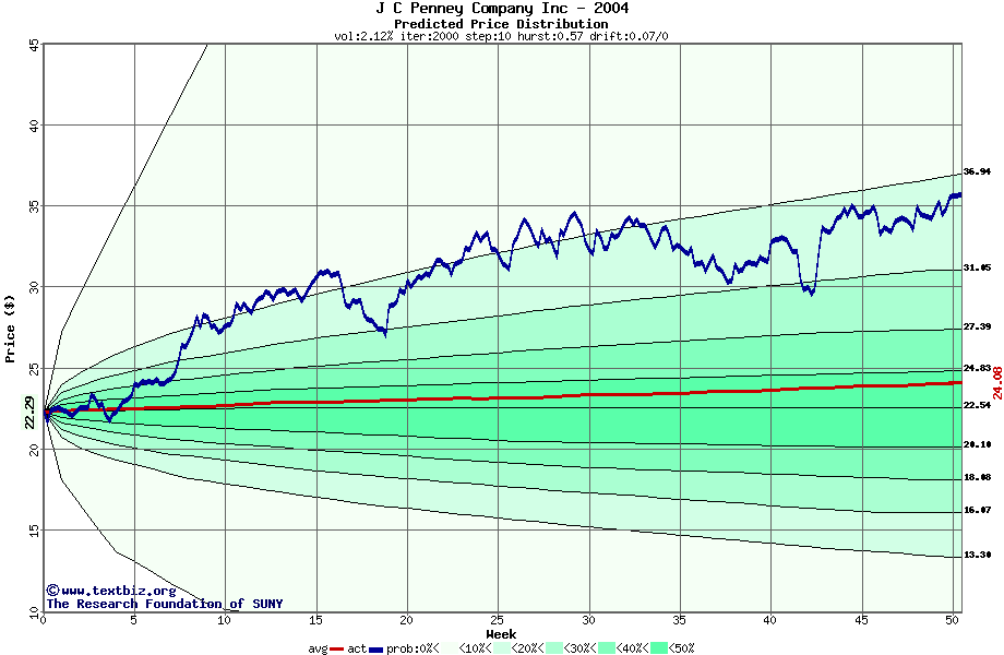 The following graph plots the year-to-date performance of the stock for 2004 compared to the probability calculated by a random walk model.