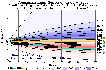 The high to date and low to date prices of the stock plotted against a random walk model for 2006 (what's this?).