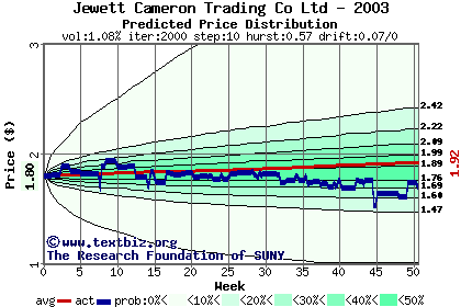 The high to date and low to date prices of the stock plotted against a random walk model for 2003 (what's this?).
