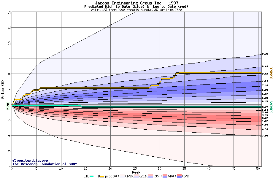 The high to date and low to date prices of the stock plotted against a random walk model for 1997 (what's this?).