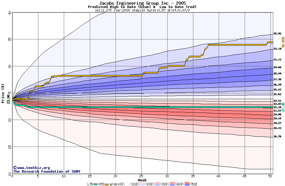 The following graph plots the year-to-date performance of the stock for 2005 compared to the probability calculated by a random walk model.