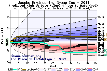The high to date and low to date prices of the stock plotted against a random walk model for 2011 (what's this?).