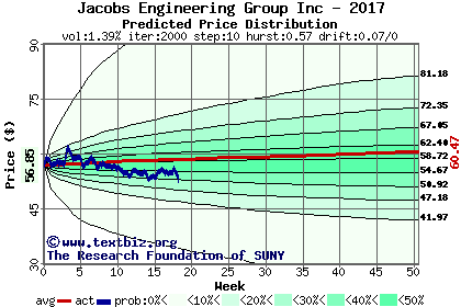The high to date and low to date prices of the stock plotted against a random walk model for 2017 (what's this?).
