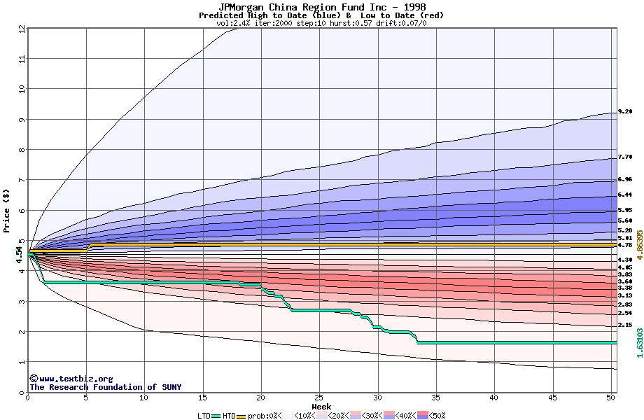The high to date and low to date prices of the stock plotted against a random walk model for 1998 (what's this?).