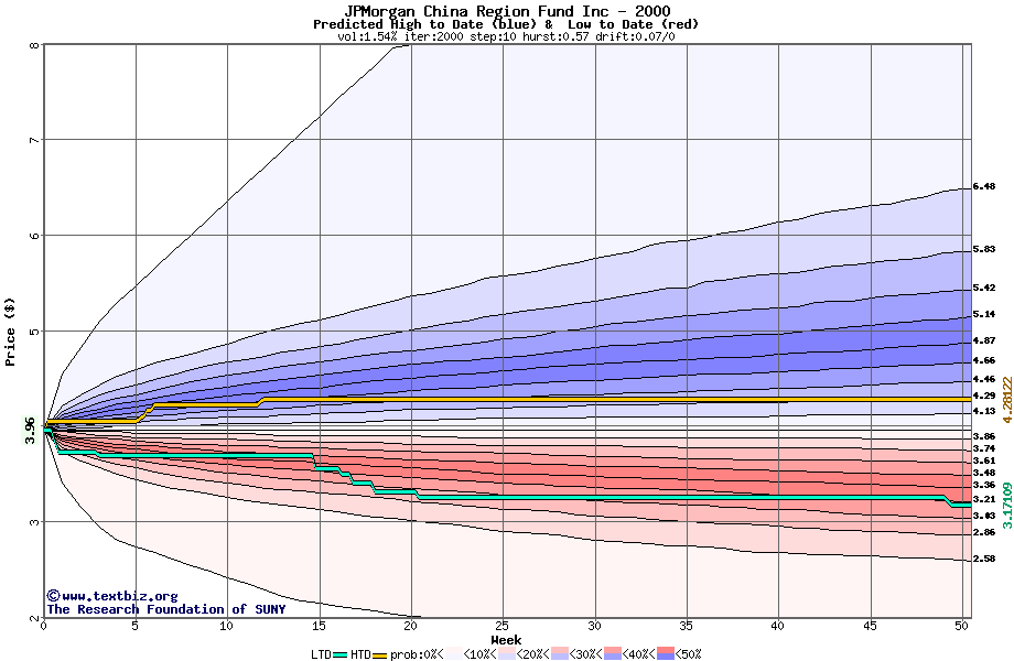 The high to date and low to date prices of the stock plotted against a random walk model for 2000 (what's this?).