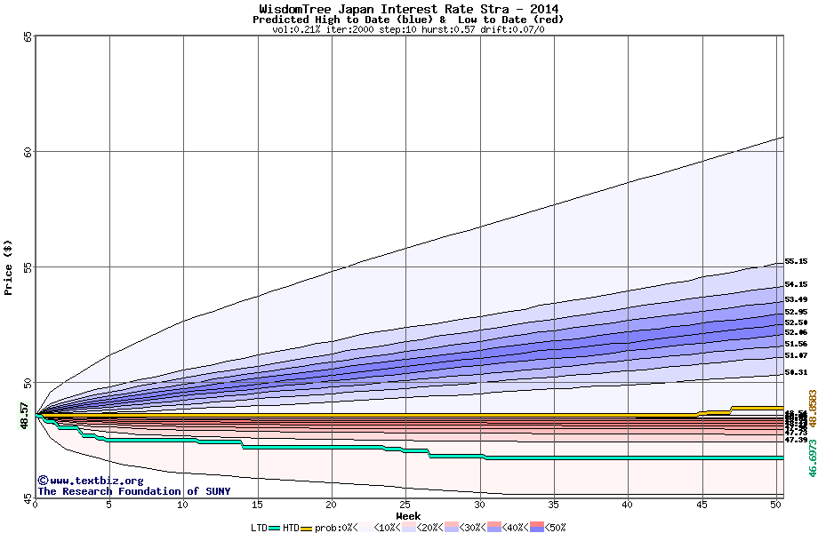 The following graph plots the year-to-date performance of the stock for 2014 compared to the probability calculated by a random walk model.