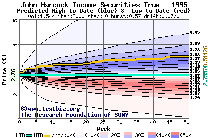 The high to date and low to date prices of the stock plotted against a random walk model for 1995 (what's this?).