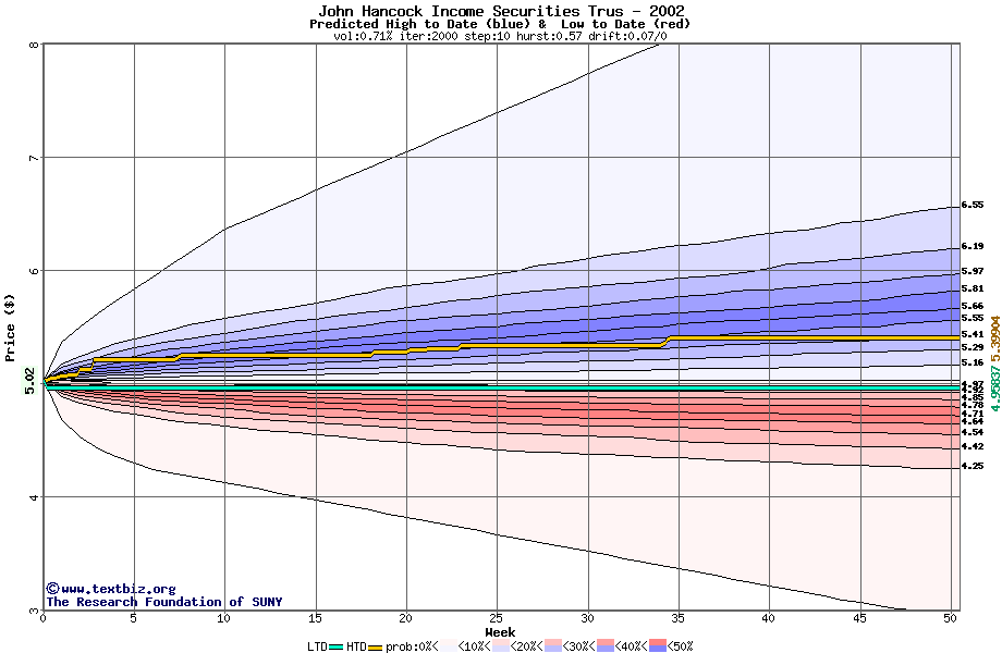 The high to date and low to date prices of the stock plotted against a random walk model for 2002 (what's this?).