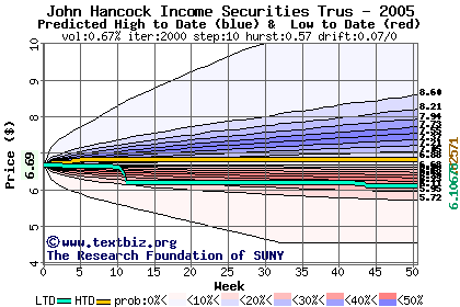 The high to date and low to date prices of the stock plotted against a random walk model for 2005 (what's this?).