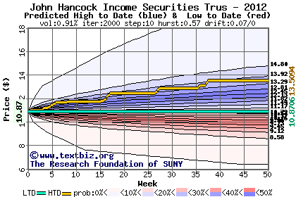 The high to date and low to date prices of the stock plotted against a random walk model for 2012 (what's this?).