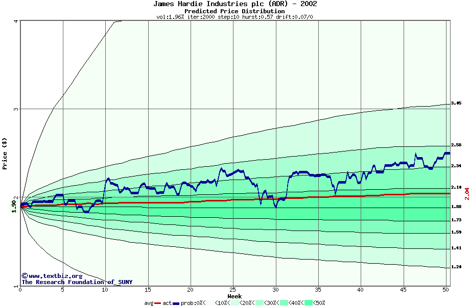 The following graph plots the year-to-date performance of the stock for 2002 compared to the probability calculated by a random walk model.
