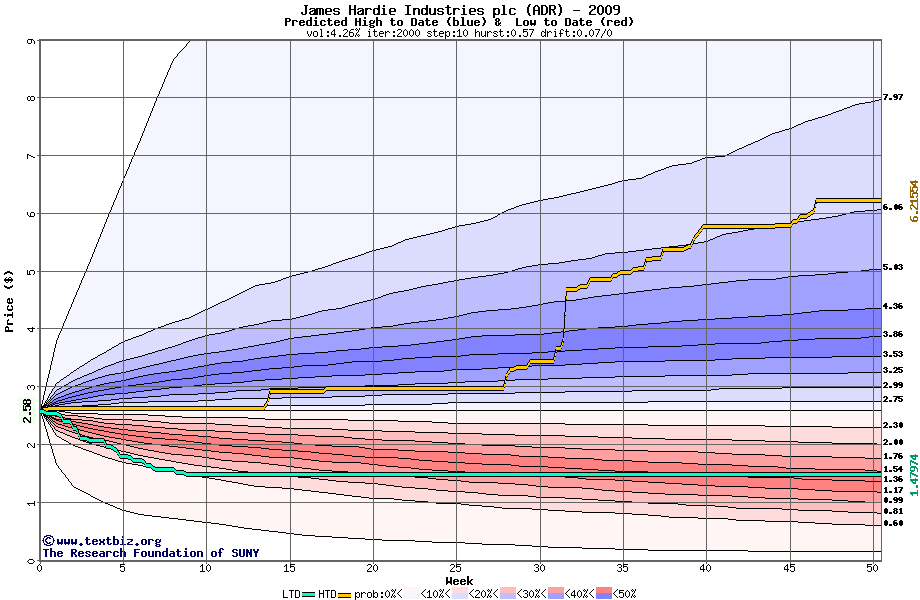 The high to date and low to date prices of the stock plotted against a random walk model for 2009 (what's this?).