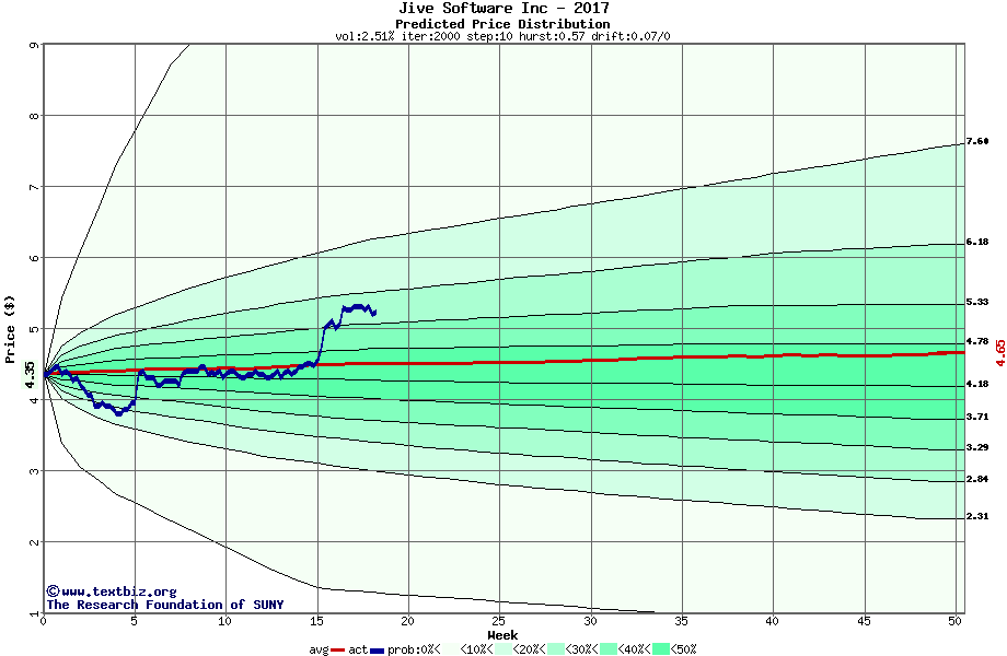 The following graph plots the year-to-date performance of the stock for 2017 compared to the probability calculated by a random walk model.