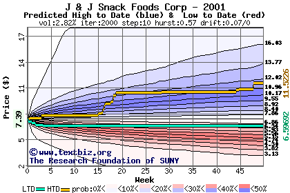 The high to date and low to date prices of the stock plotted against a random walk model for 2001 (what's this?).