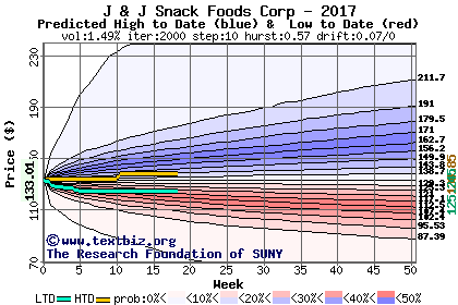 The high to date and low to date prices of the stock plotted against a random walk model for 2017 (what's this?).