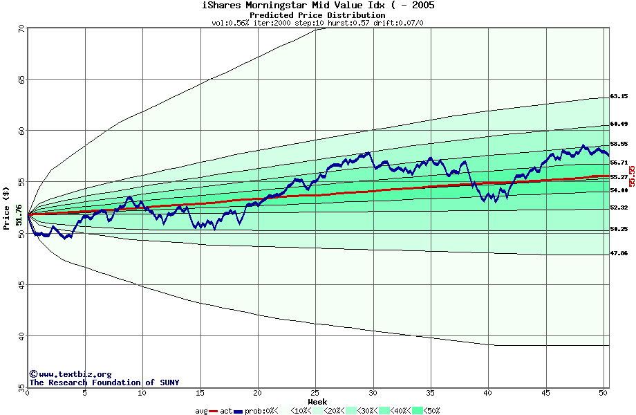 The following graph plots the year-to-date performance of the stock for 2005 compared to the probability calculated by a random walk model.