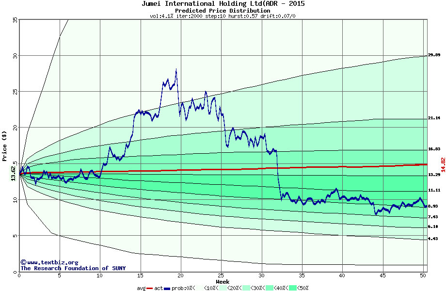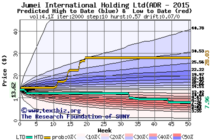 The high to date and low to date prices of the stock plotted against a random walk model for 2015 (what's this?).