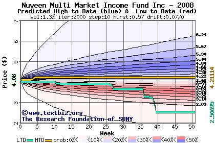 The high to date and low to date prices of the stock plotted against a random walk model for 2008 (what's this?).