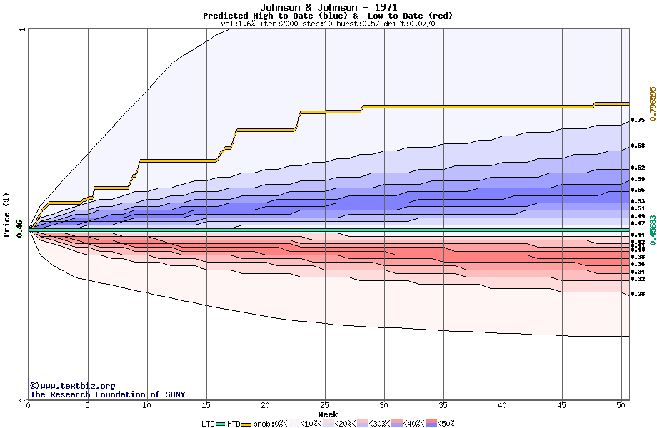 The high to date and low to date prices of the stock plotted against a random walk model for 1971 (what's this?).