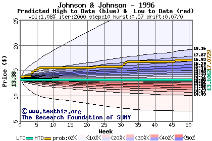 The high to date and low to date prices of the stock plotted against a random walk model for 1996 (what's this?).