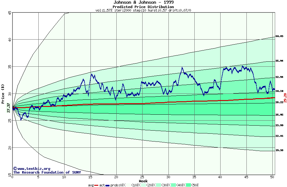 The following graph plots the year-to-date performance of the stock for 1999 compared to the probability calculated by a random walk model.