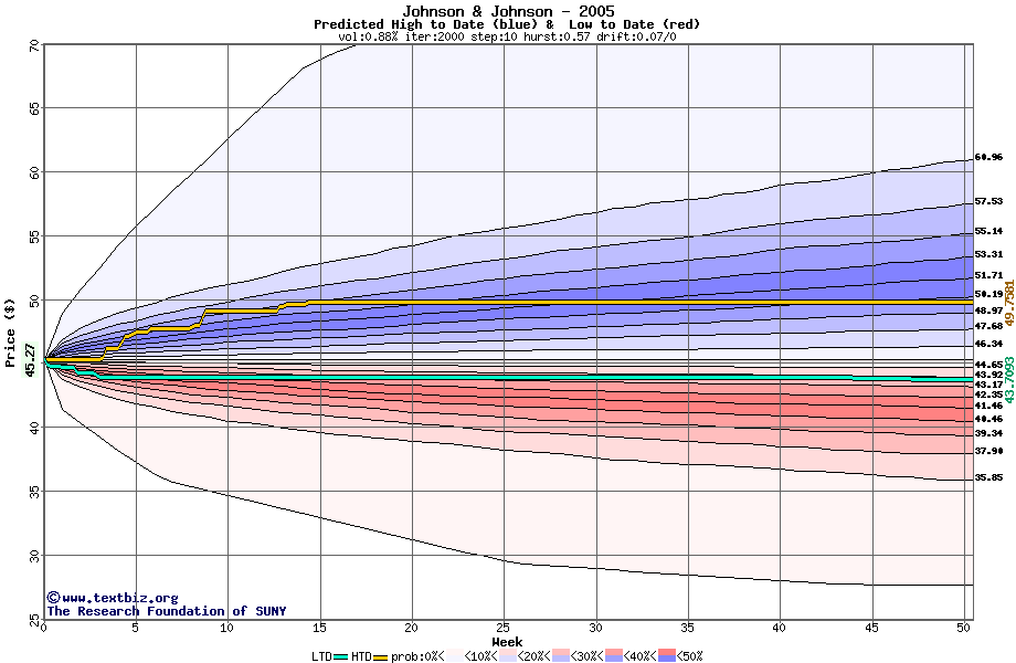 The high to date and low to date prices of the stock plotted against a random walk model for 2005 (what's this?).