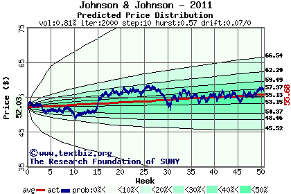 The high to date and low to date prices of the stock plotted against a random walk model for 2011 (what's this?).