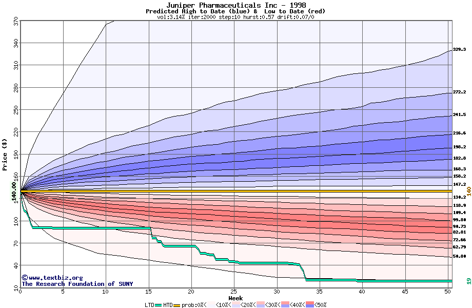 The high to date and low to date prices of the stock plotted against a random walk model for 1998 (what's this?).
