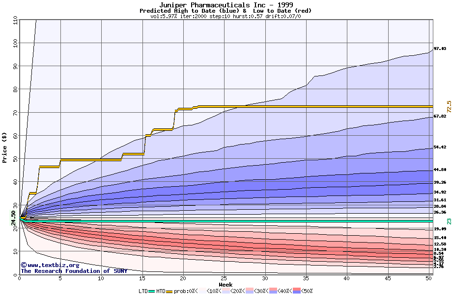 The high to date and low to date prices of the stock plotted against a random walk model for 1999 (what's this?).