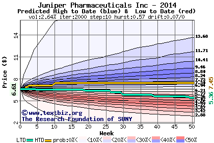 The high to date and low to date prices of the stock plotted against a random walk model for 2014 (what's this?).