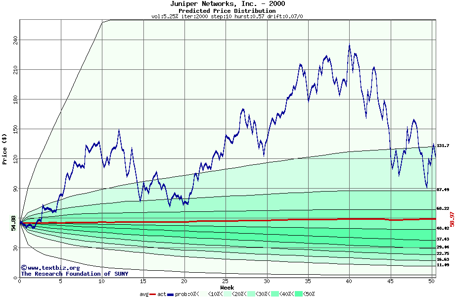 The following graph plots the year-to-date performance of the stock for 2000 compared to the probability calculated by a random walk model.