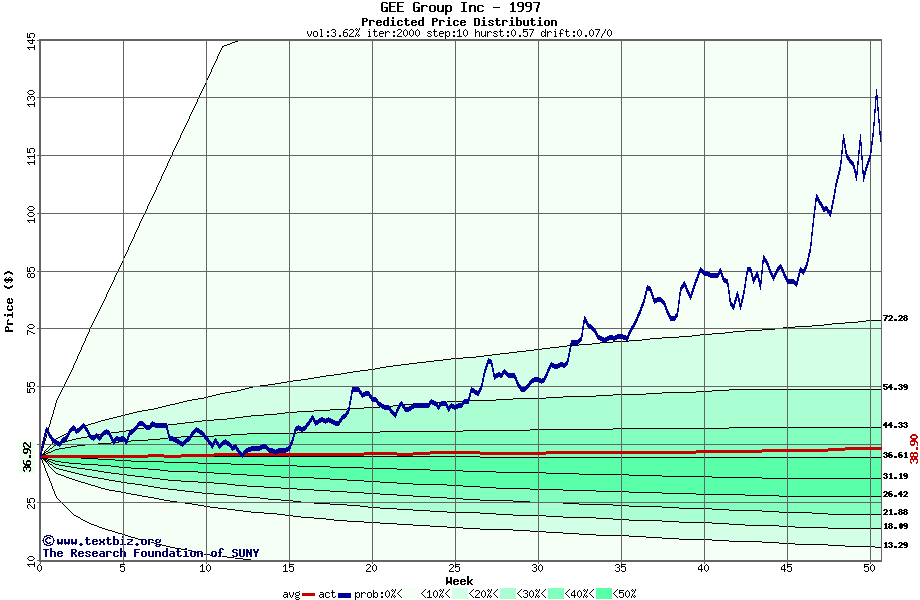 The following graph plots the year-to-date performance of the stock for 1997 compared to the probability calculated by a random walk model.