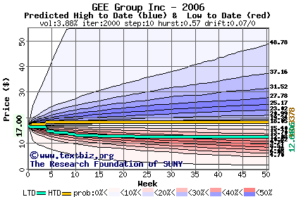 The high to date and low to date prices of the stock plotted against a random walk model for 2006 (what's this?).
