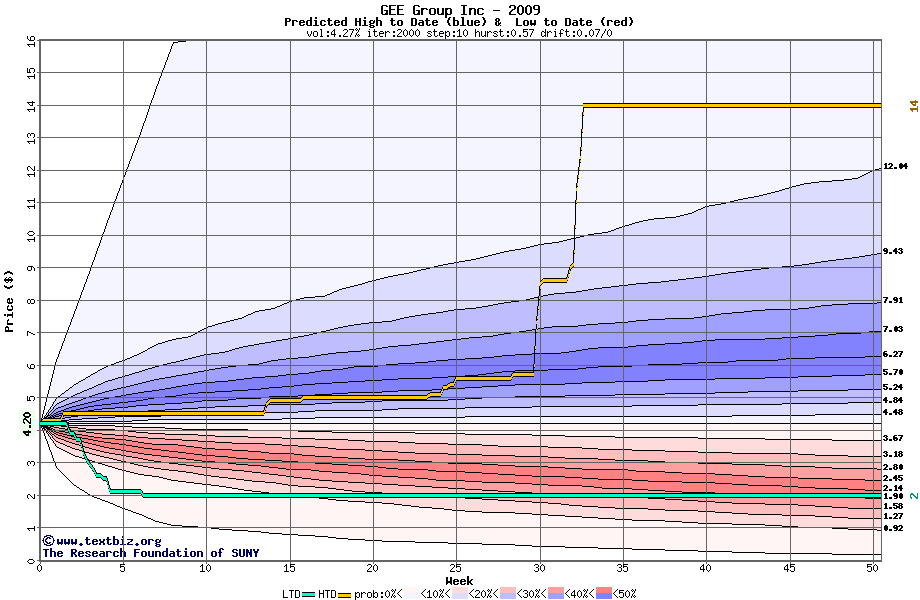 The high to date and low to date prices of the stock plotted against a random walk model for 2009 (what's this?).