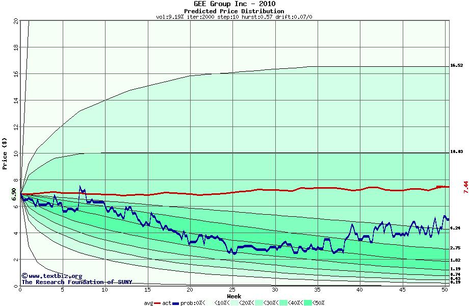 The high to date and low to date prices of the stock plotted against a random walk model for 2010 (what's this?).