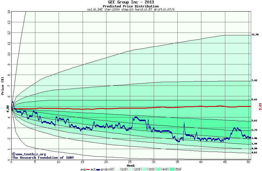 The high to date and low to date prices of the stock plotted against a random walk model for 2013 (what's this?).