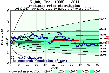 The high to date and low to date prices of the stock plotted against a random walk model for 2011 (what's this?).