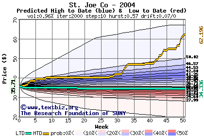 The high to date and low to date prices of the stock plotted against a random walk model for 2004 (what's this?).