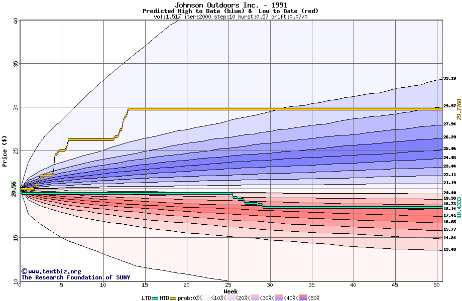 The following graph plots the year-to-date performance of the stock for 1991 compared to the probability calculated by a random walk model.
