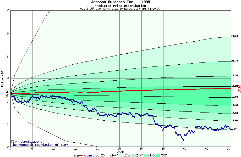 The following graph plots the year-to-date performance of the stock for 1998 compared to the probability calculated by a random walk model.
