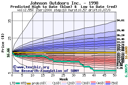 The high to date and low to date prices of the stock plotted against a random walk model for 1998 (what's this?).