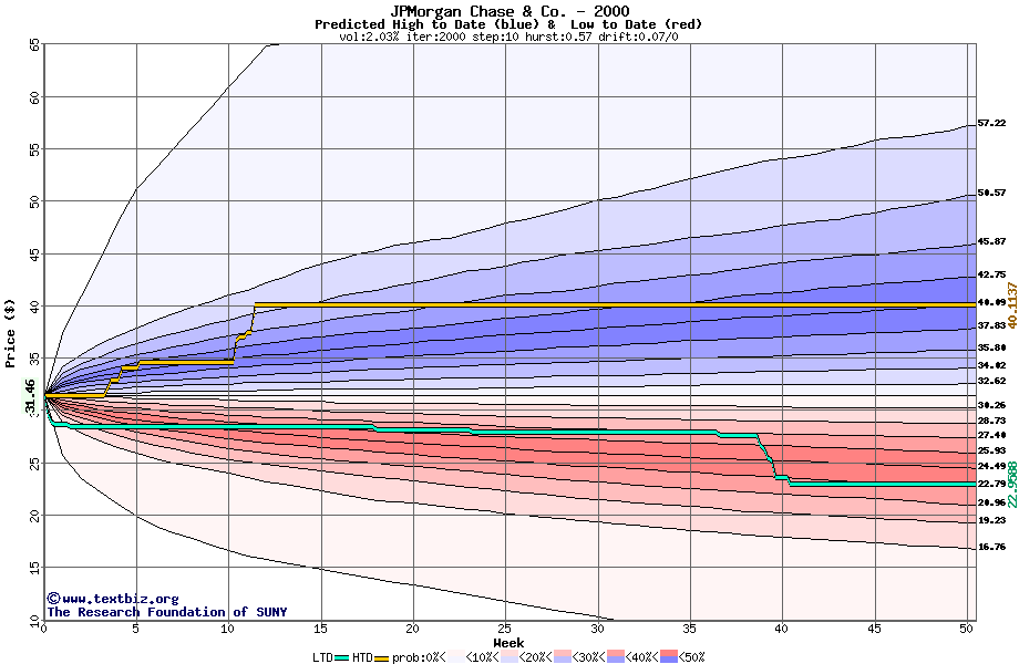 The high to date and low to date prices of the stock plotted against a random walk model for 2000 (what's this?).