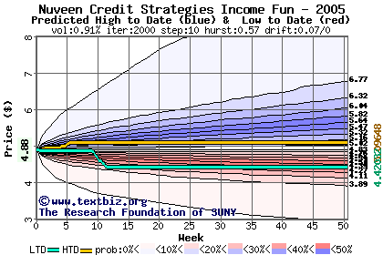 The high to date and low to date prices of the stock plotted against a random walk model for 2005 (what's this?).