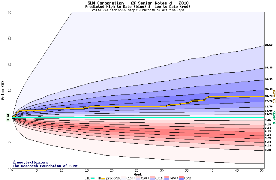 The high to date and low to date prices of the stock plotted against a random walk model for 2010 (what's this?).