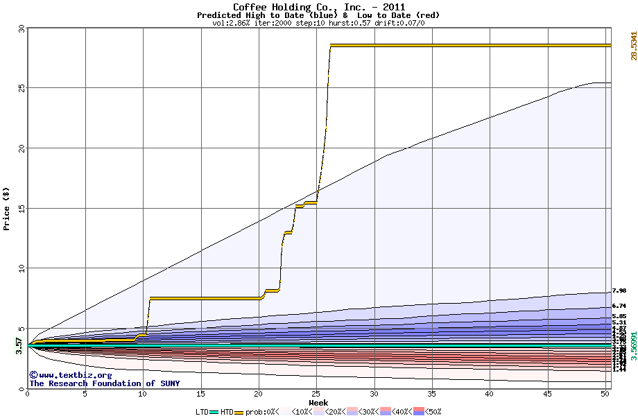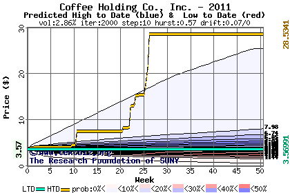 The high to date and low to date prices of the stock plotted against a random walk model for 2011 (what's this?).