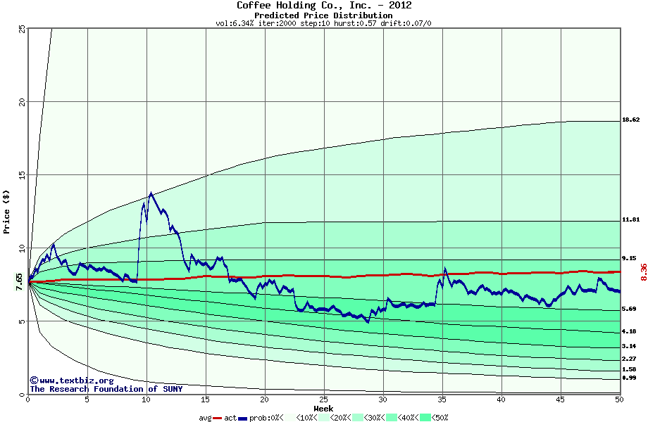 The following graph plots the year-to-date performance of the stock for 2012 compared to the probability calculated by a random walk model.