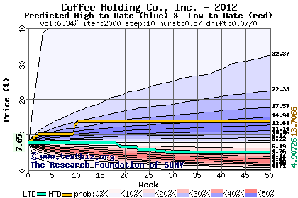 The high to date and low to date prices of the stock plotted against a random walk model for 2012 (what's this?).