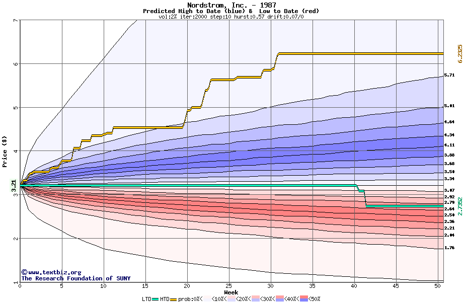 The high to date and low to date prices of the stock plotted against a random walk model for 1987 (what's this?).