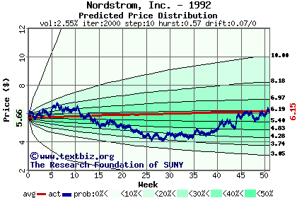 The following graph plots the year-to-date performance of the stock for 1992 compared to the probability calculated by a random walk model.