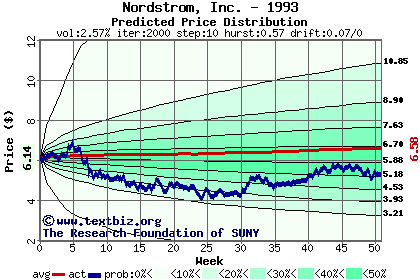 The high to date and low to date prices of the stock plotted against a random walk model for 1993 (what's this?).